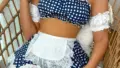 この衣装はスクール風のコスプレで、透け感のあるショートボタンシャツとミニ丈のプリーツスカートを組み合わせたセットです。襟元には大きめのボウタイリボンが付き、胸ポケットと縁取りのパイピングがアクセントになっています。半袖シャツは薄手のメッシュで身体のラインをほのかに透かし、軽やかな質感と抜け感を演出します。ウエスト位置が高めの短いプリーツスカートは脚線を強調し、ニーハイソックスと合わせることでバランスよくまとまります。撮影やコスプレイベント、プライベートなシーンでの使用に適したデザインです。