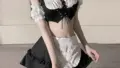 この衣装はセーラーをモチーフにしたシアーなランジェリー風コスチュームです。透け感のある薄手メッシュ素材で仕立てたショートトップはアンダーバストが大胆に出るアンダーエッジデザイン、Vラインのセーラーカラーと小さなリボンチャームがポイントになっています。ウエスト高めのミニスカートはフレア寄りのプリーツ風シルエットで、裾に入ったラインテープとウエストベルトのタッセル飾りがアクセント。ヘッドリボンとガーターベルト付きのニーハイ風ストッキングで統一感を出せるため、撮影やイベントのコスプレ、プライベートなランジェリー撮影、テーマパーティーなどで視線を集める一着です。