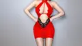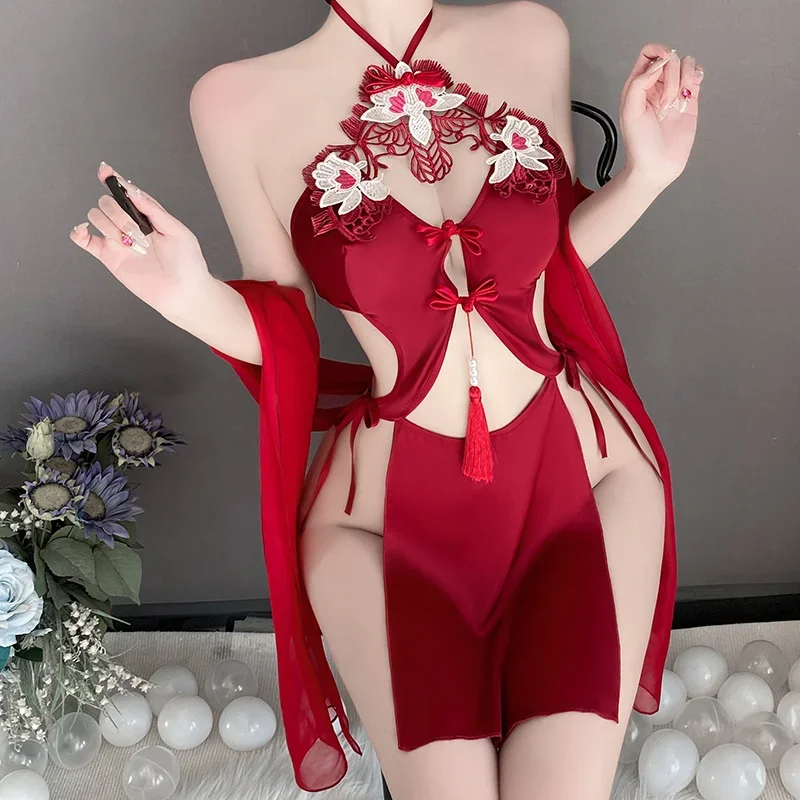 この衣装は大胆なチャイナテイストを取り入れたランジェリー風ワンピースで、光沢のあるボディ素材と透け感のあるシフォンを組み合わせた一着です。ハルターネックに刺繍の花装飾が胸元を華やかに飾り、中央のリボンとパール付きの房飾りが視線を引きます。両サイドは大きくカットされたハイレグ仕様でウエストとヒップを強調し、背中は紐で結ぶバックレス設計。取り外し可能な長いシフォンスリーブが動きに優雅さを添え、ミニ丈の前スカートが脚線を際立たせます。撮影やイベント、プライベートなシーンで存在感を発揮する一着です。