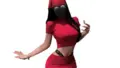 光沢の強いPVC素材で仕立てられたビスチェ風コルセットと、フリル&レースのミニスカートを組み合わせたアンサンブルです。コルセットはカップに成形が入り、前中心はアイレットを通したレースアップで締める構造になっており、ウエストのサイドを切り取ったようなカッティングが視線を集めます。スカートは光沢のある外層と下に覗く繊細なレースの二重構成で、動きに合わせて表情が変わります。アームカバーは取り外し可能な長手袋風、チョーカーはバックル留め、ガーターストラップでブーツと接続する仕様です。チェーンやハート型チャーム、手錠風アクセサリーなどメタル装飾がポイントになっており、素材のコントラストと小物のディテールで世界観を作るデザインです。