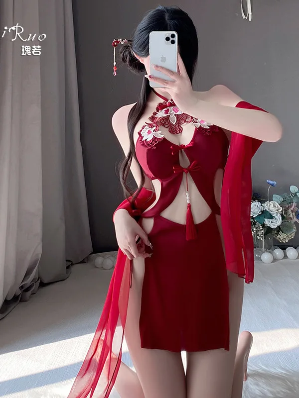 チャイナ(中国風)モチーフを取り入れたホルターネックのランジェリー風ドレスです。首元はホルターストラップで留める仕様、胸元には花の刺繍モチーフが重ねられ、中央にハート状のくり抜き(キー ホール)が見えます。胸部は成形されたカップラインで縫い目が入り、前中心に小さなリボン留めが連続して配置され、腹部にはビーズとタッセルが垂れています。両サイドは大胆なカットアウトで腰とヒップを露出させるデザイン、スカートは短めで高めのスリットが入っています。背面はオープンバックで細いストラップを結ぶ仕様、肩から腕にかけては薄手のシフォン風ショールが流れるように添えられています。素材感は本体が光沢のある滑らかな布地、ショールは透け感のある薄手素材、装飾に刺繍・ビーズ・タッセル・リボンが用いられているのが写真から確認できます。仕立ては身体のラインを強調するカットと調整可能なストラップでフィット感を作る構成です。