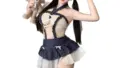 この衣装はチェック柄のミニ丈メイドワンピースをベースにしたコスチュームです。肩ひもと胸元にあしらわれた繊細なレースフリルがフェミニンな印象を与え、ウエストを絞ったボディラインがメリハリを作ります。裾はフレアに広がるミニ丈で、白いラッフルとレース縁取りの小さなエプロンが可憐なアクセントに。背面は大きなリボンで結ぶオープンバック仕様になっており、動きに合わせて軽やかに揺れる素材感で撮影映えします。チェック柄の耳付きカチューシャとTバックがセットになっており、イベントやコスプレ撮影、パーティーでの印象的なコーディネートに最適です。