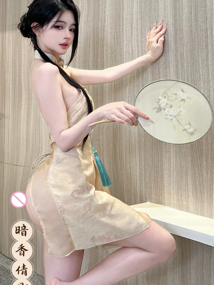 薄手のブロケード調生地と透け感のあるシフォンを組み合わせたミニ丈のチャイナドレス風ワンピースです。首元はハイカラーのホルターネックで、胸元に斜めのくり抜きが入り、伝統的なチャイナボタンと房飾りでアクセントを付けています。ウエストは背面のレースアップでフィット感を調整でき、後ろは大胆に開いたバックレス仕様。スカートはパネル切替とフレアで裾に動きを持たせ、両サイドのシフォンがスリットのように脚線を覗かせます。縫い目は細いパイピングで縁取られ、全体に散らした小さな花柄が上品な表情を作ります。裏地は薄手で透け感をコントロールし、セットのTバックと合わせることで、軽やかさと女性らしいシルエットを強調する構成になっています。