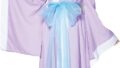 この衣装は、鮮やかな赤色の透け感のある素材を基盤とし、古典的な東洋の美しさをモチーフにした構造である。胸元はレース風の切り替えと、黒い細いストラップが交差するハーフトップのデザインで、露出を巧みに演出している。袖は広がるバルーンスリーブで、袖口には金色の刺繍と円形のコインが多数垂れ下がっており、動きに合わせて音を立てることで、視覚的・音響的な魅力を増す。腰回りには、赤いシースルーの帯が巻かれ、その上部には金色の刺繍とコインの装飾が施されており、腰のラインを強調する。さらに、背中側には縦に長いスリットが入った透け感のあるスカートが付属しており、歩くたびに裏地や身体の輪郭が見え隠れする。裾には金色の花模様と点の刺繍が縦に並び、光を反射してきらめく。全体はシースルー素材を多用し、身体の輪郭を暗示する構成となっており、素材の重なりと透明性によって想像を喚起させる。頭には赤い花のヘアアクセサリーが添えられ、古典的な雰囲気を強調している。