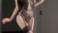 この衣装は、うさ耳カチューシャとふわふわのファーテールを組み合わせたバニースタイルのレースボディスーツです。ノースリーブで深いVネック、ブラカップと透け感のあるシースルーレースがバストラインを柔らかく包み、フロント中央にサテンリボンを編み上げたコルセット風の装飾でウエストを強調します。背面はホック留めで背中を開いたハイレグシルエット、ハイカットの裾が脚長効果を生むタイトフィットです。付属のベル付きチョーカーやレースフィンガーレスグローブ、網タイツやフリル付きニーハイと合わせて完成するコーデで、撮影・コスプレイベントやプライベートなパーティーに映える一着です。股下はスナップ留めで着脱がしやすく、遊び心のあるディテールが際立ちます。
