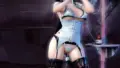 この衣装はナースコスチュームです。ホワイトと赤を基調としたセットで、深いVネックのホルターネック型トップと光沢のある赤いプリーツミニスカートが組み合わされています。トップは薄手のシースルー素材で、胸部に十字マークのパスティが配置されており、バストラインが透けて確認できます。ノースリーブで肩から脇は露出し、背面は大きく開いたバックレス仕様です。スカートはウエストを高めに絞るワイドな帯状のベルトラインと短い丈で太もも上部が大きく露出し、後方はハイレグに近いカットのTバックが見えて臀部が露出しています。薄手のトップと光沢素材のスカートという素材の対比で布と肌の境界が明確になっており、胸元の深いV字とスカート裾のプリーツが視線を誘導します。付属品として白いナースキャップが含まれています。
