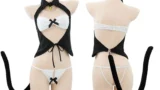 この衣装は学生風コスチュームのセットです。上衣は襟付きのノースリーブ風切り替えで、襟と同素材の細めネクタイが胸元に接続されています。胸元は白い薄手ブラでV字に開き、ブラ上縁から鎖骨下までの肌が露出しています。ミニプリーツスカートは腰位置で吊りベルトにより留められ、裾から太もも前面に約10〜12cmの肌が露出しています。背面はTバック風の小さな開口とリボン結びで会陰部近くまで肌が見える設計です。サスペンダー金具が前で留まり、動作でずれやすい構造です。素材は薄手のシースルー混チェック生地と白の透けるブラ生地の組合せで、フリル縁と小さなリボン装飾がアクセントになっています。付属は襟タイ、吊りベルト一体のスカート、Tバックタイプの下着、ニーハイ(網目やリボン付き)です。イベント撮影やコスプレ撮影、プライベートシーンでの着用に適しています。