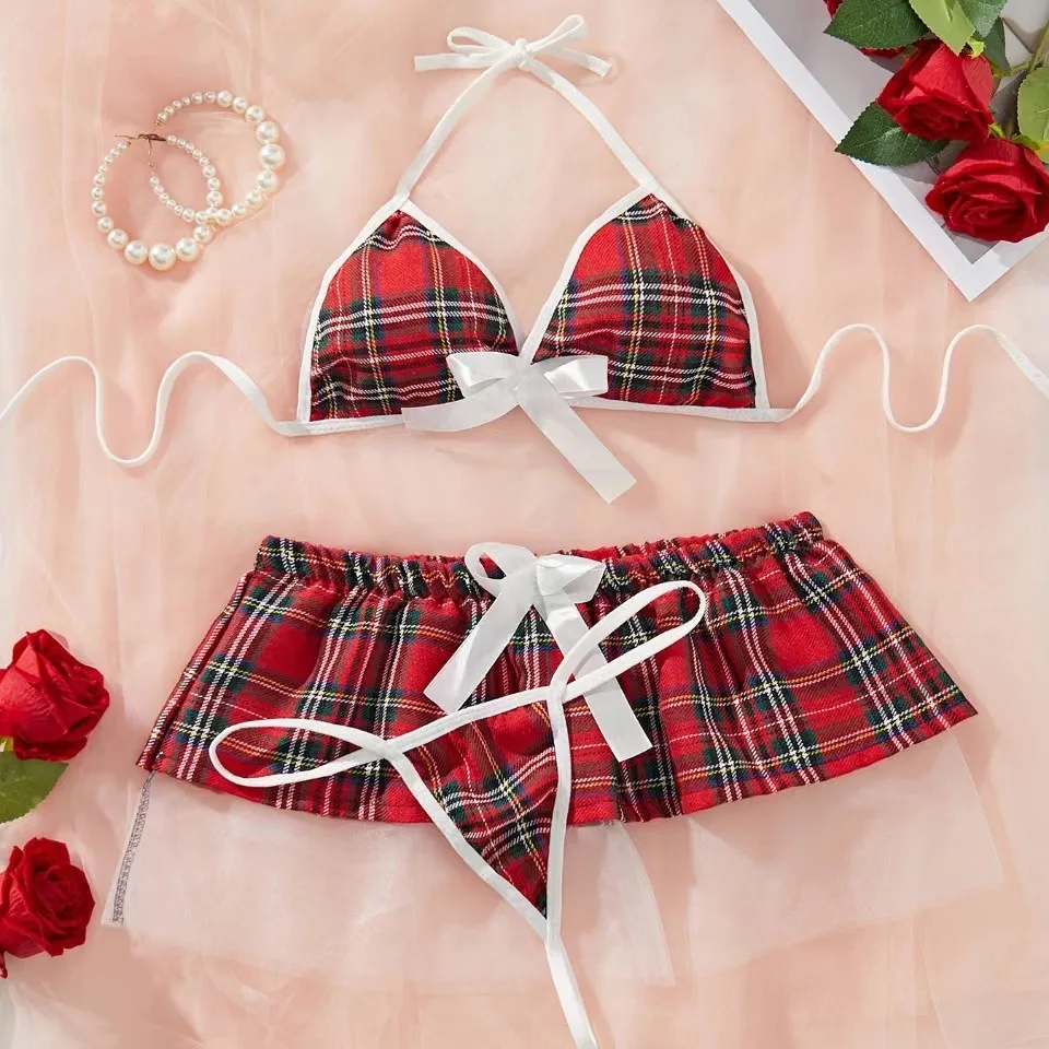 この衣装は学生系コスプレです。デザインは極短のミニ丈スカートと三角ブラのセットで、丈はウエストゴムから裾まで短いフレアシルエット、袖は無くホルターネックのネックラインです。布と肌の境界はブラの白縁が鎖骨下から胸谷間までを区切り、胸下の白リボンが胸下端の境界です。スカートはウエストラインから太もも上部まで約8cmの肌が露出し、裾下のチュールと外布の間に約1〜2cmの隙間があります。動作で緊張を生む仕掛けは首で結ぶ薄いホルターストラップ、浅いアンダーライン、伸縮するウエストゴムで、これらは動くとずれ・めくれやすい構造です。対比構造は赤タータンのカジュアル感と白サテンリボンの甘さ、上は小さく控えめな三角ブラで下は太ももを大胆に見せる短さという上下のコントラストです。素材感はタータン柄のマットな布地と光沢あるサテンリボン、裾裏に薄手のシースルーチュールがあります。装飾は中央の大きな白サテンリボンと裾フリルが中心で、付属は腰ゴムとネックリボンです。着用シーンはイベントや撮影、室内のプライベート利用に適しています。