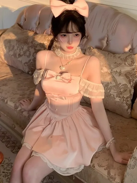 商品名 ピンクレースのバレエスリーブドレス レディース 夏用 ウエスト絞り プリンセスライン スカート 甘い袖のギャザー蝶柄