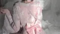 サテンの光沢を帯びたビスチェ風の上身頃と、くびれを強調するウエスト切替が印象的なワンピースです。細いストラップに加え、肩先を覆う二段のラッフルスリーブがオフショルダーのような「間」を作り出しています。胸元には大ぶりのリボンと中央のビジューが配され、視線を集める装飾ポイントになっています。スカートはギャザーでふんわり広がり、内側のレースペチコートが裾から覗いて女性らしいレイヤード感を添えます。首元には同素材のフリルチョーカーがあり、全体を統一する繊細なレースとフリルの扱いが細部まで効いています。日差しや小物(大きなリボンやパラソル)と合わせやすい、完成度の高いフェミニンなデザインです。