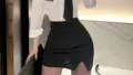 肩を露出するオフショルダーのビスチェと連結しない長めのスリーブ、チョーカー風の衿がセットになった構成です。トップは厚みのあるベロア調の生地で形成され、胸元に丸く切り取られたキーカットが入り、中央の谷間を強調するデザインになっています。カップサイドには細めのパイピングが入っているのが見え、立体感を補助しています。ウエストは幅広のギャザーベルト風パーツで締め、腰周りは透けるメッシュパネルと細いストラップで構成されたガータースタイルの造りです。股部分はストラップを用いたGストリングに近い開放的なカットで、着用感を伸縮性のある生地と細いゴムで調整する仕様です。装飾として胸元・袖口・チョーカーにフェイクファーのトリミング、腰や太ももにはフリル状のチュール、太ももには網目状のタイツ(網タイツ)が組み合わせられており、素材のコントラストで視線を誘導する作りになっています。