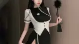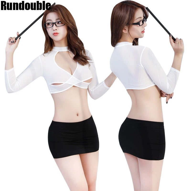この衣装は教師をイメージしたセクシーなコスプレセットです。ハイネック風のチョーカーネックと大きなフロントのキーシェイプ開口が特徴のクロップトップは、胸元を大胆に見せるデザインで、アンダーバスト部分に斜めに重なるバンド風のカットアウトが入っているため視線を集めます。袖は細身の長袖で、薄手のストレッチ素材は肌にフィットしてボディラインを強調し、光沢感が控えめにエレガントさを添えます。ボトムはウエストローライズの極短ミニスカートで、タイトなシルエットが脚線を際立たせます。付属小物はない商品イメージですが、メガネや指示棒などの小物を合わせると教師モチーフが際立ちます。パーティーやコスプレイベント、ポートレート撮影やクラブシーンなど、華やかさと大胆さを求める場面に適した一着です。