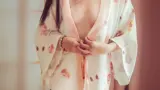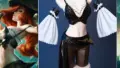 この衣装は和風と中華テイストを融合したミニ丈のコスプレドレスです。光沢のあるジャカード調オーバーピースがペプラム状に重なり、淡い柄入りのインナースカートと二段で広がるフレアシルエットが特徴です。胸元は盤扣(チャイナボタン)を配したビスチェ風のフィット感で、ハイネックのレースインナーを重ねて首元を華やかに見せます。袖は肩に小さなフリルのあるパフ気味の肩線から裾広がりのベルスリーブに繋がり、動くたびに表地の光沢と竹・筆文字風の柄が映えます。ガーターやリボン、和風の髪飾りと合わせれば撮影やイベント、和洋折衷のパーティーで映える一着です。