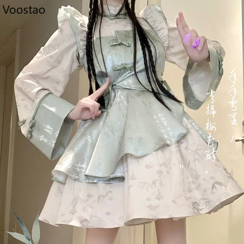 新中華風ヴィンテージロリータプリンセスドレス 女性用エレガントゴシック竹の葉プリントチョンガスマニードレス スウィートY2Kドレス