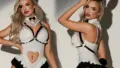 この衣装はバニースタイルのボディスーツコスチュームで、深めのスウィートハートネックラインと高めのカットでウエストからヒップにかけてメリハリのあるタイトシルエットを作ります。肩は透明ストラップとオフショルダー風のフリルアームを組み合わせて肌見せを強調し、背面はファスナーで着脱がしやすい設計です。光沢のある伸縮素材が滑らかにフィットし、レース縁のガータートップと網タイツ、手首のカフスや襟+小さなリボンタイ、取り外し可能なうさ耳とふわふわのしっぽがセットになっています。透明ストラップは調整可能でフィット感をカスタマイズでき、スタジオ撮影やコスプレイベント、パーティーなど非日常のシーンで映える1着です。