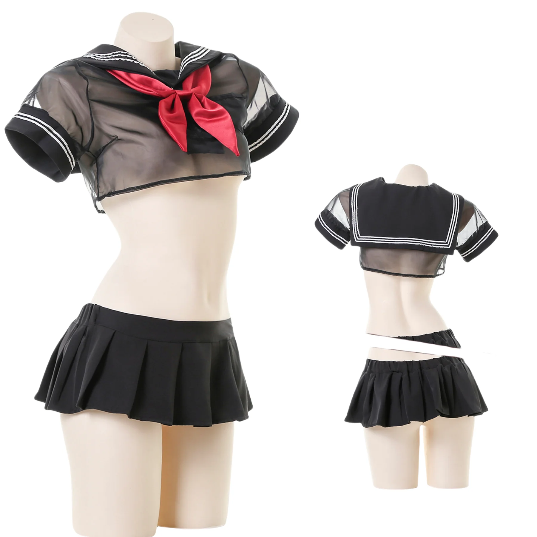 この衣装はセーラーをモチーフにしたミニマルなコスプレセットです。特徴としては、胸下でカットされたクロップドシルエットのシースルートップに幅広のセーラーカラーと三本ラインのトリムが施され、サテン調のネクタイ風リボンが顔まわりに光沢を添えるデザインです。袖はショートスリーブで、背面に落ちるセーラーフラップがクラシックな印象を残します。ボトムはウエストゴム仕様のプリーツスカートで非常に短いミニ丈、動きに合わせて広がるフレア感がポイントです。素材は透け感のあるメッシュとしっかりめの布帛の組み合わせで、視覚的なコントラストが強く、ヘルシーな肌見せでセクシーさを演出しつつスクール風のキュートさも併せ持ちます。コスプレイベントや撮影、パーティー、SNS用のポージング撮影に特に適した一着で、個性を出したい方におすすめです。