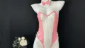 この衣装はメイドモチーフを取り入れたワンピース型のコスチュームです。胸元はギャザー入りのスクエアネックで、ショルダーにはふんわりとしたパフスリーブが付き、バストラインをやさしく包みます。ウエストはタイトでボディラインを強調するハイレグ寄りのシルエット、サイドはカットアウトに赤いリボンで結ぶデザインがアクセントになっています。裾や袖口には透け感のあるフリルがあしらわれ、伸縮性のある光沢を帯びた素材でフィット感と動きやすさを両立。付属のチョーカーやニーハイ風ソックスと合わせれば撮影やコスプレイベント、テーマパーティーで映える一着です。