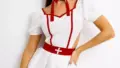 ナースをモチーフにしたピンクのコスチュームです。丈は極めて短いミニ丈で、シルエットはタイトなボディコン型です。袖は短袖で、襟は立ち襟に前ボタンが並ぶ構造、胸元に横長のカットアウトがあり中央に赤十字のワッペンが配置されています。左右の胴部分は白い紐で編み上げるサイドレース構造となっており、腰から太もも側面が大きく露出しています。前面に白いフリル付きエプロンが付属し、腰後部はリボンで結ぶデザインです。太ももには白いストラップ(ニーハイ風の帯)があり、布と肌の境目と開口部の配置で視線が集まる構成です。生地は薄手で伸縮性のある布地と、フリルや編み紐のコントラストで質感の差が演出されています。