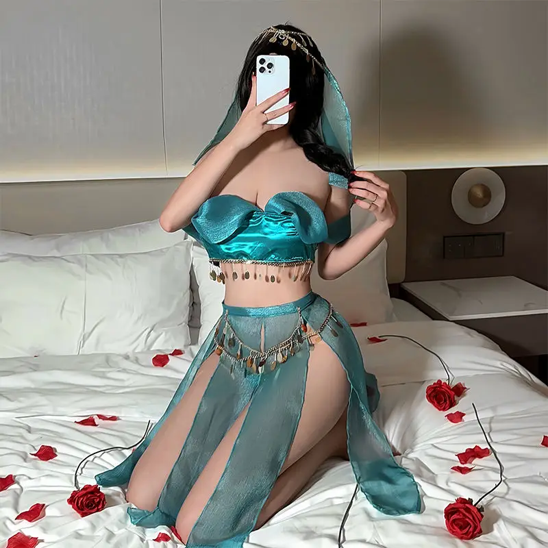 この衣装はアラビアンテイストを取り入れたベリーダンス風のコスチュームで、胸元を強調するバルコネット型のオフショルダートップと、脚線を大胆に見せる縦長スリット入りのスカートを組み合わせたセットです。トップは光沢感のある生地で立体的なカップラインを作り、ウエスト下には揺れるコインフリンジを施して動きに合わせて視線を集めます。スカートは透け感のある薄手素材を縦に配して流れるようなフレア感を出し、ハイウエストで腰まわりをすっきり見せるシルエットです。ヘッドチェーンとベール、コイン付きチェーンベルトが付属し、撮影やステージ、パーティーなど華やかな場面で映えるデザインに仕上がっています。着脱しやすいベルト仕様のため小物との組み合わせでアレンジも楽しめます。