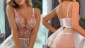高めのチョーカーネックで首元を囲み、両胸を縁取るスカラップレースが中央に大胆なVラインを作るテディです。身頃は透け感のあるフローラルレース(メッシュ状の地糸に刺繍的な花柄)が全面に使われ、ウエスト位置で切り替えが入ることで腰まわりに小さな裾のスカラップが広がります。前中心下部は縦開きのオープンクロッチ構造で、ヒップ側は細いストラップで構成されたTバック寄りのバックレス。首元はリボン結び、背面には細いストラップと金具の留め具が見られ、縁取りは全てスカラップ仕上げになっています。透け感とカットのコントラストで身体のラインを強調する作りです。