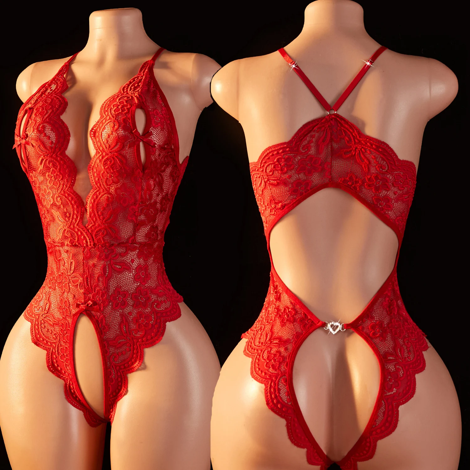 商品名 | セクシーなリボンとレースのパッチワーク クロッチレスランジェリー エロティックボディスーツ ハート型デコレーション クリスマスモチーフの情熱的なギフト |