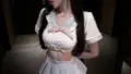 滑らかで伸縮性のあるサテン調ストレッチ素材を使用したワンピース型のボディスーツです。肩は短めの半袖、胸元は大きく開いたVネックで深く落ち込み、バストを強調する大胆なカットが特徴です。ウエスト付近で布をねじったツイストギャザーが入り、前中心にドレープと立体感を生み出しています。腰からヒップにかけてはハイレグ(ハイカット)で脚長効果を作り、バックはシンプルにヒップラインを包むカット。前開き仕様のスナップ(暗ホック)が付いており、機能面にも配慮されたデザインです。縫製は沿うようなカッティングでボディラインにフィットします。