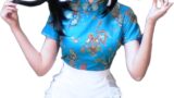 全体はメイドモチーフを柔らかく女の子らしく解釈したドレスです。胸元は白いプリーツ状のパネルをアクセントにしたビスチェ風の切り替えで、スクエアネックに沿ってフリルが縁取られています。ウエストは絞りの効いたコルセット風の構造で、左右に並ぶ飾りボタンと編み上げ風のディテールが視線を集めます。袖は短めのパフスリーブで、袖口にレーストリムがあしらわれており、襟は丸みのある白い襟がリボンで結ばれるデザインです。スカートは短めのティアード仕立てで、下段に薄手のシフォン風レイヤーがのぞき、裾に沿ってふんわりとしたボリュームを作っています。装飾はリボン、小さなカバー釦、フリルとレースが中心で、可憐さを強調する構成になっています。