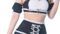 身体に沿うタイトなミニドレスに、修道服の記号をモダンに落とし込んだデザインです。ハイネックにクロス状のオーバーレイを配し、その下に胸元のカットアウトとスウィートハート風の切替が入っているのが特徴です。ウエストから裾にかけては縦の切替で引き締めを作り、裾はV字に尖らせたヘムにクロスのアップリケを縫い付けています。付属のベール風ヘッドピース、指なしのロンググローブ、太ももまであるストッキングもセットになっており、グローブには同じモチーフの装飾が施されています。素材は光沢を帯びた伸縮性のある合成繊維で、ボディラインにフィットする一方で着脱は背面のファスナーで行う仕様です。ミニ丈かつフィット感が強めなのでサイズ選びに注意が必要です。