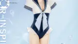 光沢のあるサテンを基調に、繊細なレースとチュールが重なるブライダルランジェリーです。胸元はレース縁取りのカップで深いVラインを描き、中央に垂れるビジューのチャームが視線を集めます。サイドに大きく入ったカットアウトと高めのハイレグカットで脚線を強調し、薄手のオーバースカートが柔らかく流れることで“間”を作っています。ロングベールは縁にスカラップ状のレースを配し、頭部にはパールやビーズの装飾があしらわれています。肘丈のサテン手袋、レースガーターと同素材の太腿用ストッキングがセットされ、素材の光沢と透けの対比で視覚的な奥行きが出ています。縫い目やストラップ類は細かく仕立てられており、撮影向けの演出性を重視した仕上がりです。