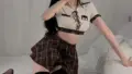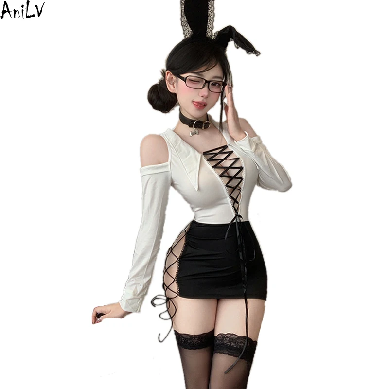 白いトップは肩を露出させるオフショルダーのカットで、深いV字の開きに沿って幅広の編み上げリボンが施されています。胸元の編み上げはコルセットのように腰へ向かって視線を導き、ウエストの絞りを強調して見せます。ボトムはタイトなミニスカートで、側面が大胆に編み上げによって肌が覗くカットアウトになっており、ヒップラインを際立たせます。ストッキングは上部にレースバンドが付いた太もも丈で、トップのレーストリムと呼応しています。アクセントとしてレース縁のバニー耳ヘッドバンド、金具付きのチョーカー、細めのサテン風リボンや編み紐などの装飾が組み合わさり、全体にフェミニンで引き締まったシルエットを作り出しています。生地は光沢の少ない滑らかな伸縮性素材に見え、縫い目や編み上げの処理がデザインの要となっています。