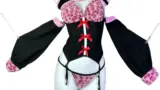 ハイネックのチョーカーデザインから胸元にかけて大胆に開いたモチーフカットが目を引くワンピース型のボディスーツです。光沢のある伸縮性素材を基調とし、胸部は四葉を思わせる装飾的なカットアウトで大きく露出、そこには虹彩のように輝くビジュー貼りのニップルカバーが配されています。両脇から腰にかけては繊細なチェーンが垂れ、背面は編み上げでフィット感の調整が可能です。付属のベールは薄手のチュールで十字架の小さなワンポイントがつき、レースグローブとレーストップのサイハイストッキングがセットになっています。Tバックのハイレグカットと身体に沿うシルエットで脚と腰のラインを強調する作りです。