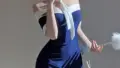 このワンピースは一枚でボディラインを強調するミニ丈のボディコンデザインです。胸元は細い帯状のパネルが斜めにクロスして開口を作るアシンメトリーな構成で、内側に成形されたブラカップが組み込まれて安定したホールド感を与えます。ウエスト位置には透け感のあるメッシュ切替が入り、視覚的に引き締まったメリハリを生みます。スカート部は膝上の短い丈で、後身頃にギャザーを寄せてヒップラインを丸く見せる設計です。素材は光沢を抑えたマイクロファイバー系のストレッチ生地で伸縮性が高く、身体に沿って滑らかにフィットします。縫製はできるだけ細かく処理されており、同系色のTバックがセットになっているためワンセットでのコーディネートが完結します。