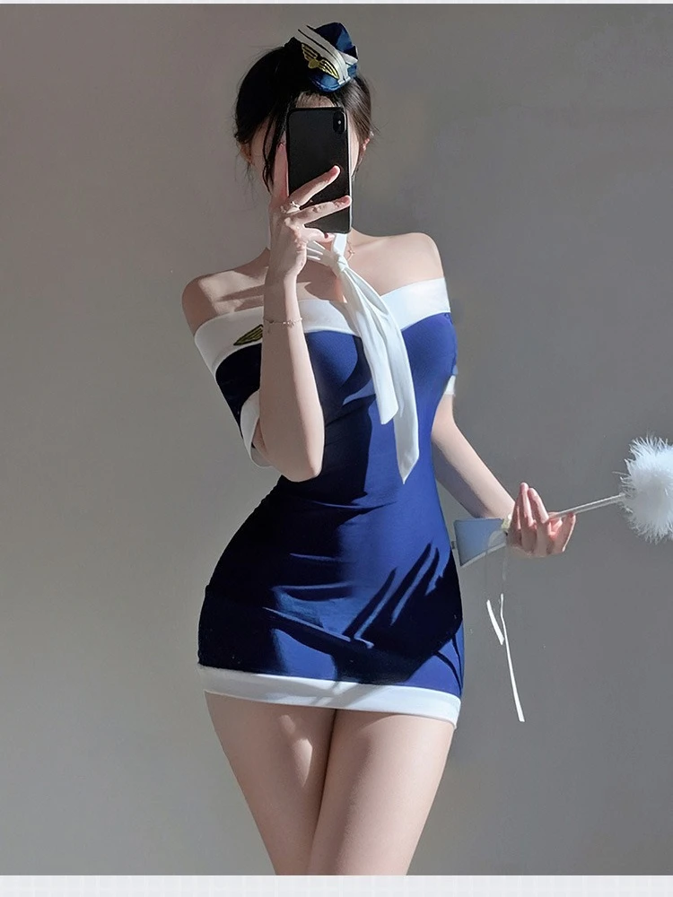 オフショルダーの広めな白い衿が肩線を強調する、客室乗務員モチーフのタイトミニワンピースです。身頃は伸縮性のあるジャージー系素材で体に沿うボディコンシルエットを描き、ウエストからヒップにかけてのラインを際立たせます。袖口と裾には同じ白いパイピングが施され、胸元には翼を象ったワッペンがワンポイントになっています。付属のネッカチーフは前で結ぶ仕様、小ぶりなプチハットを合わせることでモチーフ性を高めています。写真にはTバックやストッキングを合わせた着用例も見られ、短めの丈設定で脚線を強調する設計です。全体のカッティングはシンプルながら、縫い目とダーツで立体感を出した作りになっています。