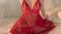 画像の衣装は、深いVラインのホルターネックボディをベースにしたレーステディです。花柄モチーフの刺繍レースが全体に施され、肌を透かすシースルー感が際立ちます。胸元と股下に小さなサテンリボンを配し、スカラップ状の縁取りが柔らかな輪郭を作っています。背中は大きく開いたカットアウトで、腰位置にハート型の小ぶりな金具でつなぐディテールが見られます。ヒップはハイレグ寄りのカッティングで、伸縮性のあるメッシュ混レースが体に沿う設計です。ウエスト付近は切り替えでやや絞られたシルエットになっており、カラー展開を想定したスタイリング例(ヘッドアクセ等)も提示されています。素材感は薄手のレースと柔らかなメッシュで、肌馴染みの良い軽さが特徴です。