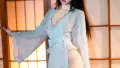 首元がクロスするホルターネックと透ける前身頃が特徴のベビードールセットです。上胸は透けメッシュに細かな花刺繍が施され、中央には揺れるタッセルがアクセントになっています。身頃は薄手のオーガンジー/シフォンのレイヤーで柔らかく落ち、裾に向かってふんわり広がるAライン。背中は細いストラップでリボン結びにするバックオープン仕様、脇や前に入ったスリットで肌の抜け感を作っています。付属のローブは光沢のあるサテン調素材でゆったりした袖とドレープを持ち、セットで纏うと質感の対比が生まれます。下着はTバックの細ストラップで、全体に軽やかで浮遊感のある構成です。