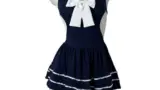 黒を基調に白フリルと差し色のラインを効かせた、スチュワーデスを想起させるミニセットです。トップはホルターネック型の三角カップで深いVラインを作り、カップ下に連なる透け感のあるフリルが視線を集めます。バックは紐で結ぶバックタイ仕様になっており、肩甲骨や背中をすっきり見せます。スカートはタイトなボディコンシルエットのミニ丈で、ウエストに同様のフリルを配して腰回りのアクセントに。ヒップ側にカットアウトが入り、後姿の抜け感を演出します。小振りな帽子型ヘッドピースと組み合わせることで統一感が生まれ、ストッキングはフィッシュネットやレーストップなど、組み合わせで表情を変えられる構成です。全体は伸縮性のある滑らかな生地感に見え、身体のラインを強調するデザインです。
