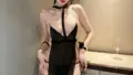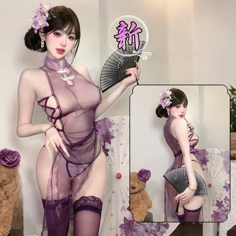 ハイネックのチャイナ風モチーフを取り入れた、軽やかなシースルーワンピースです。首元には小さなチャイナボタン(盤扣)とキー ホールが配され、そこから胸元へと薄く透けるメッシュ素材が素肌のラインを拾います。両脇は細いストラップで編み上げるレースアップ仕様になっており、サイドリボンでフィット感を調節できます。前後に入った大胆なスリットと高めにカットされたヒップラインにより、立体的なシルエットが強調されます。裾やストッキングの上部にはレース装飾や花柄の刺繍があしらわれ、装飾的なアクセントを添えます。素材は薄手のチュール/メッシュで伸縮性はあるものの非常に繊細なため、引っ掛かりや摩擦には注意が必要です。パジャマやランジェリーとしてだけでなく、和洋折衷の小物と合わせてコーディネートを楽しめる一着です。