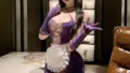 薄手のチュール素材を何重にも重ねた、透け感を主役にしたミニドレスです。バストは中央でギャザーを寄せて形成したカップラインになっており、中央のメタルモチーフが視線を集めます。ホルターネックから肩を斜めに渡すストラップがトップを支え、胴回りはねじるように巻き付けるラップ状のカットアウトでウエストを強調します。背面は大きく開いたバックレス設定で、ヒップはタイトにフィットするショート丈。伸縮性のあるシースルー生地がボディラインに沿って滑らかに馴染み、付属のTバックで下着の収まりも考慮された構成です。装飾はビジューやブローチ風の金属パーツで、華やかさと透けの軽やかさを両立させています。