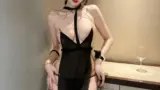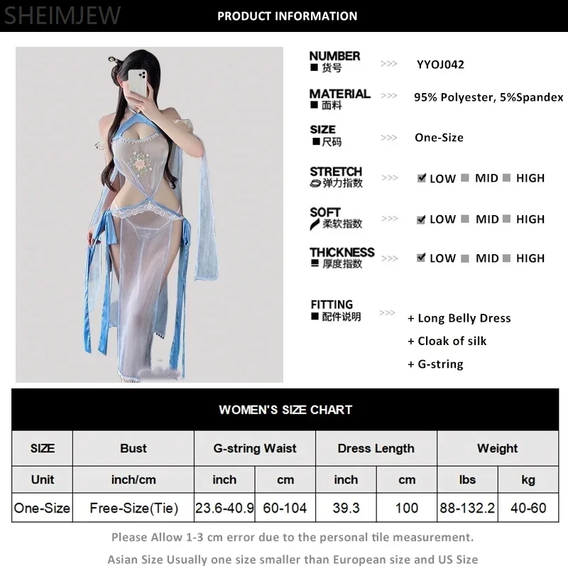 薄手のシースルー素材で仕立てられたロングスリップです。胸元には小ぶりな花の刺繍が配され、上辺にはビーズ風の縁取りが添えられているため視線を集めます。ホルターネックから胸のカットアウト、ウエストの細い三角カットでボディラインを強調し、背面はリボンで結ぶオープンバック仕様です。両サイドに長いサテンのリボンを結ぶデザインと、レース縁取りのGストリングが付属します。素材表記はポリエステル95%、スパンデックス5%で伸縮性は控えめ、非常に薄く繊細なため優しく扱う必要があります。