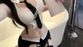 薄手のシースルー素材を用いたトップスに深いVネックを組み合わせ、胸元を大胆に見せることで「間」を作った一着です。Vラインは波型のレーストリムで縁取りされ、肌と布地の境界を柔らかく際立たせています。袖は肘近くまである半袖でフィット感があり、ウエスト位置は高めに切り替えたエプロン風のミニスカートで下半身を包み込みます。スカートはAラインに近い短めの丈で、動きに合わせて裾がめくれる設計です。太ももにはレーストップのストッキングとガーターベルトが組み合わされ、縦ラインが脚を強調します。首元にはオーガンジーのリボンがあしらわれ、小さなチャームがアクセントになっています。ヘッドドレス風の小さな帽子やフェザーの小道具がコーディネートされ、メイドモチーフを分かりやすく演出しています。全体は透け感とレースの重なりで隠す部分と見せる部分のバランスを作り、視線を誘導するデザインです。