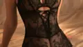 薄手のシースルーメッシュを主体にしたローブ型ガウンです。ボディは透けるメッシュ素材で仕立てられ、胸元と前中心に沿って縫いつけられた花柄レースが視線を誘導します。ネックラインと袖口はスカラップ状のレースで縁取りされ、七分丈に近い袖は軽やかに腕に沿います。前開きのデザインにサテンの幅広リボンベルトを組み合わせ、ウエストで結ぶことでドレープ感と締めの表情を作れる構成です。裾には控えめなスリットが入り、動くたびに生地が揺れて柔らかな陰影を生みます。裏地やカップのない一枚仕立てなので、インナーとのレイヤードで印象を変えやすいアイテムです。