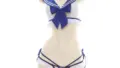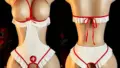 胸元から胴へと縦に伸びるシースルーパネルと細いストラップが目を引く一着です。ホルターネックで肩まわりをすっきり見せ、背面は大胆なオープンバック仕様。ウエスト付近はコルセット風に切り替えられ、胴のくびれを際立たせる構造になっています。スカート部分は多層のチュール/オーガンジーを用いたティアードでふんわり広がり、裾には花の刺繍とアップリケがぐるりと配されています。カップ中央には小さなローズモチーフとリボンがアクセントになっており、レーストップのストッキングとの組み合わせ提案も見られます。背面と首元は紐で結ぶ調整式でフィット感を変えられ、透け素材と装飾の「間」が想像を誘うデザインです。