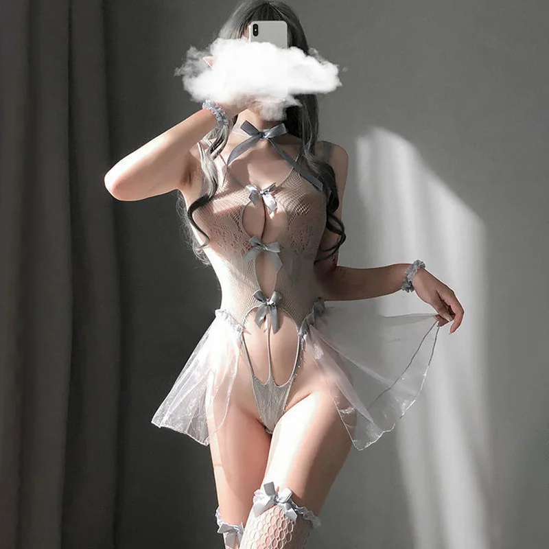 身頃に目の粗いメッシュと花柄レースのモチーフを組み合わせたワンピース型のボディスーツです。フロントは縦に三つ並んだ開口とサテンリボンでつなぐキーリッド風のカットアウトが入り、胸元と腹部に大きな抜けを作っています。腰まわりは短めのチュールを重ねたペプラム風スカートで軽やかな透け感を出し、背面は深い背中開きにハート型の小さな抜きが入ります。下部はハイレグのタンガカットで脚長効果を強調。付属でチョーカー風リボン、手首用のシュシュ、太ももに掛けるガーター風の飾りと網状のストッキングがセットされ、素材のコントラスト(メッシュ/チュール/サテンの光沢)で繊細さと華奢さを演出しています。