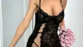 薄手のシアーメッシュを用いたボディコンミニワンピースです。柔らかなストレッチ性のある生地が身体に沿ってフィットし、ウエストからヒップにかけてのラインを強調します。肩先にはレースのオフショルダースリーブをあしらい、胸元はカットアウトで視線を誘導。カット部分には小振りのサテンリボンが配され、甘さと品のあるアクセントを添えています。裾はスカラップ状のレースで仕上げ、透け感と繊細な装飾が同居した一着です。付属のタンガと、同色の太めレーストップのサイハイストッキングでコーディネートが完成します。