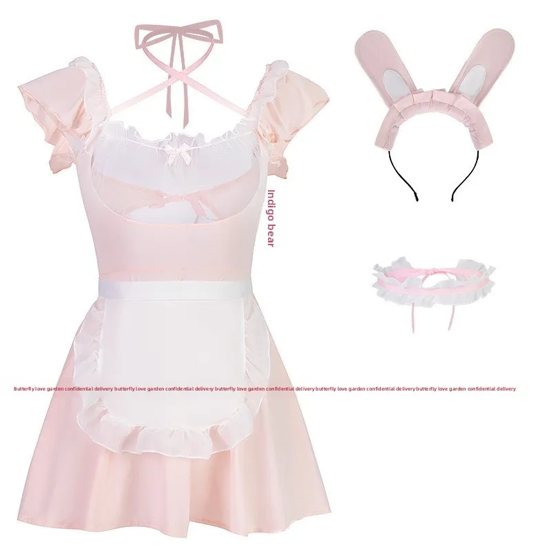 淡いピンクを基調に白いミニエプロンを合わせた、ベビードール寄りのメイド風コスチュームです。素材は光沢のあるサテン調と薄手のシアー素材を組み合わせ、胸元は透け感のあるチュールやオーガンジーで柔らかな肌見せを作っています。肩は小さなフレアスリーブで腕まわりに軽いボリュームを出し、ネックラインにはクロスしたリボンと細かなフリルトリムがあしらわれています。ウエストは切り替えで程よく絞られ、短めのフレアスカートは裾に動きをつけて可憐に広がります。付属の白いフリルエプロン、ガーターバンドに大ぶりのサテンリボン、そしてうさ耳カチューシャがセットになり、甘く遊び心のある仕立てです。コスプレ向けの見た目重視の作りで、伸縮性のある生地がフィット感を補っています。