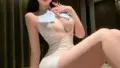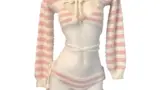 胸元はチューブトップの構成で中央を細かくシャーリングし、小さなリボンでアクセントを付けています。前面は柔らかく尖ったコルセット状のパネルを設け、ウエストを絞る視覚効果を作る一方で、実際のボーンはなくソフトな成形で体に沿います。スカート部分は薄手の透けるメッシュ素材を横方向に重ねたような構造で、サイドにリボンのドローストリングがあり長さやギャザー感を調整できます。背面は細いストラップが横に渡るバックレス寄りの切替えになっており、前後で構造のコントラストを楽しめます。全体はストレッチ性のある軽い生地で体のラインを包み込み、ムラ染めのような表情が陰影を生み出します。合わせのニーハイは縞状の透け感で足元にリズムを与えます。