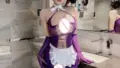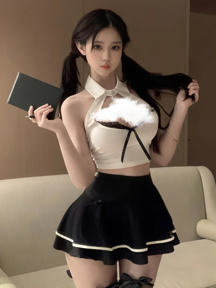 白い襟付きホルターネックトップと短めのフレアスカートを組み合わせた制服風セットです。トップは衿が独立したデザインで、胸元に大きなカットアウトを設けつつ内側にレーストリムが覗く二重構造になっています。伸縮性のある滑らかな生地でアンダーバストを幅広バンドが支え、背面は大胆なバックレス仕様でウエストラインを強調します。スカートはハイウエストの二段フレアで裾に細いパイピングが入り、立体的な輪郭を作ります。太もも部分にはガーターで固定されたストッキングと大ぶりのリボンがアクセントとして配され、全体を軽やかな動きと視線誘導でまとめています。