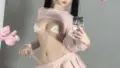 画像では一体型のテディ風ランジェリーが確認できます。ブラ部分は薄手レースで成形され、カップ縁にスカラップ状のレース縁取りが施されています。胴体は大胆にカットアウトされたオープンな設計で、前中心を縦に走るサテンリボンの編み上げと小さなリボン飾りが連なり、視線を縦方向に誘導します。腰まわりにはフリルのギャザーが付いてボリュームを作り、サイドは細いストラップで体の輪郭を強調しています。太ももには網目のハイソックス(フィッシュネット)を合わせ、別添えのレースアイマスク、チョーカー、手首カフスで統一感を出しています。全体は透け感のあるレースとサテンの光沢、編み上げやフリルといった装飾で繊細かつ女性的なシルエットを構成しています。