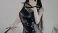 胸元はストラップレスのハートラインで、縁にフェイクファーをあしらいポンポン飾りをあしらったデザインです。前身頃は光沢のあるベロア調生地で成形され、脇とヒップ側はシースルー(メッシュ)パネルを組み合わせているため、コントラストで身体の曲線を強調します。左右のサテンリボンによる編み上げ(レースアップ)は着丈とフィット感の調整が可能で、縦方向に入ったパイピング風の切り替えがコルセットのようにウエストを引き締めます。背面はキーホール状の開きがあり、ヒップラインはハイカットに仕上げて動きに合わせて肌が覗く設計です。付属のロンググローブは同素材のベロアでファーとリボンの装飾が付いており、網タイツ等の小物合わせでクリスマスルックにしやすい作りになっています。