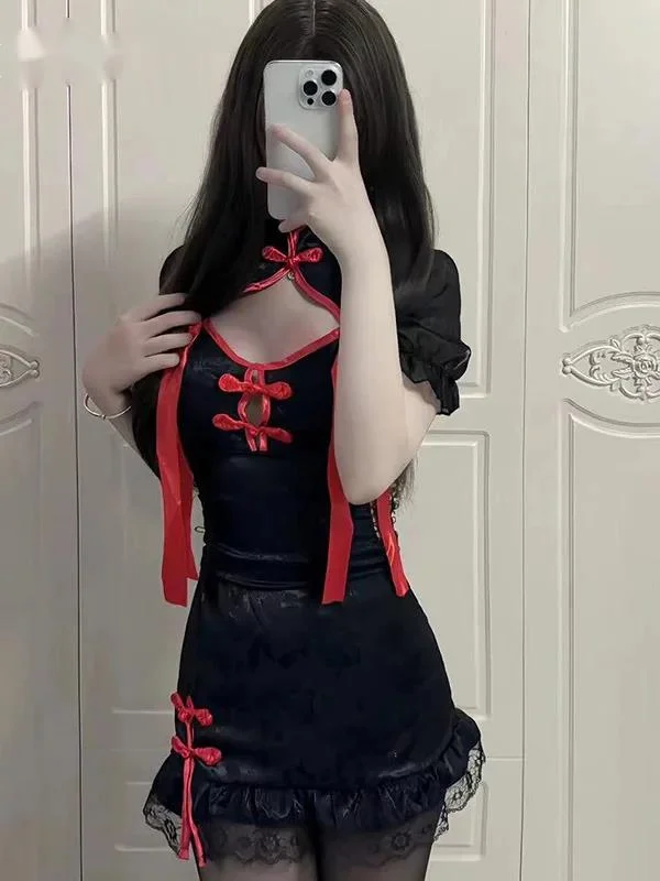 この衣装はチャイナ要素とメイド要素を融合させたミニ丈のコスプレワンピースです。タイトなシルエットがウエストラインを強調し、胸元の鍵穴カットとチャイナカラーに配した盤扣(フロッグボタン)が視線を集めます。短めのパフスリーブと裾のフリル、レーストリムがフェミニンさを添え、サイドのレースアップとリボンでフィット感を調整できます。光沢のある素材感と透けレースの組み合わせで華やかさが際立ち、ニーハイやガーターストラップと合わせれば撮影・イベント・パーティーで映える一着です。